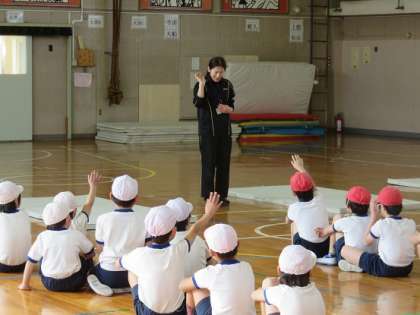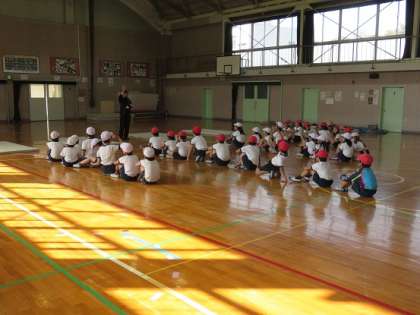 準備体操を終えると、子どもたちはみんなで力を合わせて、マットの準備をしました。そして、前転や開脚前転、後転などの技のポイントを確かめ合いました。