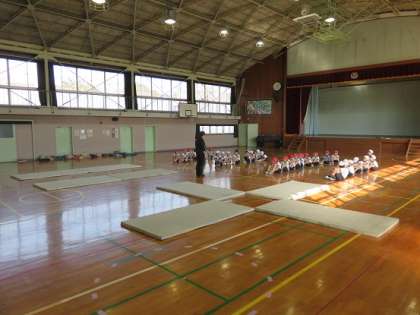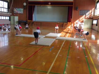 マットを2枚つなげて並べたり、4枚のマットを十字の形に組んだりして、『バリエーション』の場づくりをしました。そして、練習を繰り返し行っていました。