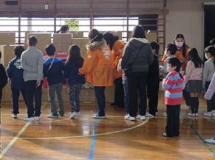 子どもたちがちょうど握りやすい大きさで、しかも丁寧に丸く仕上げられた段ボールのプリスビーを、段ボールの箱の穴にめがけて投げるコーナーも設けられていました。思った方向にプリスビーが飛ばず、何度も挑戦する子もいました。