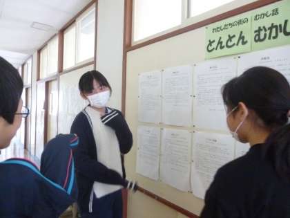6年生はインタビュー方式で行います。廊下で順番を待つ間、友達と確認をしている姿がありました。