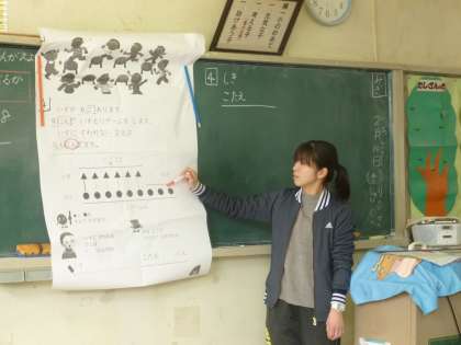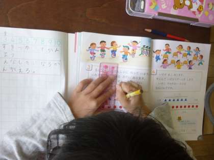 1年生の算数では、「ずをつかってかんがえよう」という学習しています。単位の違う2つの数量を、図を使って同じ数量に置き換えて式を立てるという学習です。最初は一輪車に乗っている子供の数と、残っている一輪車の数を見ながら、一輪車が全部で何台あるかを考える問題です。子供の数と一輪車の数を対応させながら一輪車の台数を求め、その後、残っている台数を足して答えを出していきます。