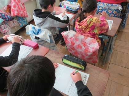 先生から配られた『聞き取りメモ』のシートに、先生が音読したお話を、子どもたちは一所懸命書き込んでいました。