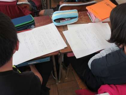 一人学習を終えた子どもたちは、隣の友だちと意見などを交流させていました。