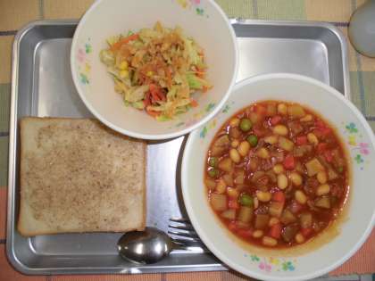 給食のサラダには、揚げかすの代わりに、パリパリに揚げたワンタン皮を野菜と混ぜていただきました。