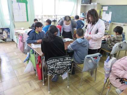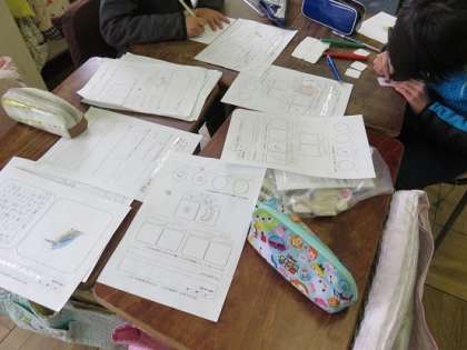 5年生の教室では、総合的な学習の時間の授業で、市制100周年に関連させた学習を行っていました。拓殖大学の工学部デザイン学科の工藤先生の研究室が、「とんとんむかし」のお話をベースに創られたカードゲームのスキルを活かして、郷土や歴史など自分が調べた事柄をもとに、オリジナルのカードゲームを作っていました。