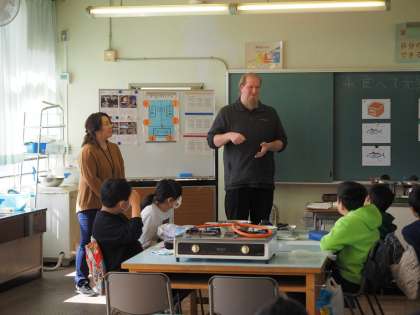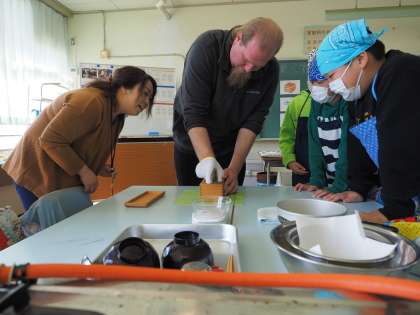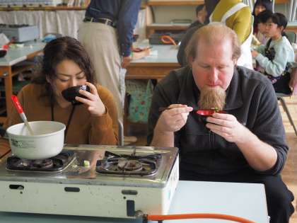 子の家庭科の取組に、JET青年のブランドン先生も参加しました。昨年に引き続き、子供たちと一緒に鰹節削りに挑戦です。昨年作ったみそ汁のおいしさに大感激し、それ以降、鰹節出だしを取ったみそ汁を自宅でも作っているそうです。今回もおいしくできたみそ汁を飲んで、日本の和食の良さを感じていただけたようです。