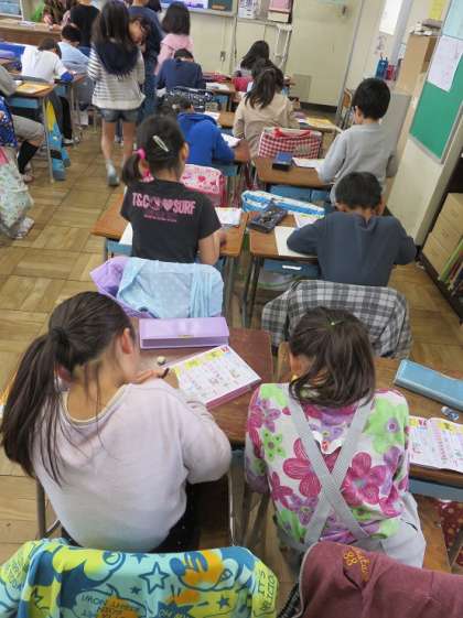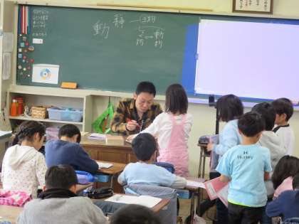 3年生の教室では、国語の学習で漢字ドリルを使って、漢字がしっかり覚えられるように、子どもたちが一所懸命に漢字の練習をしていました。そして、練習したノートを先生に見てもらっていました。