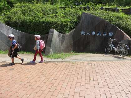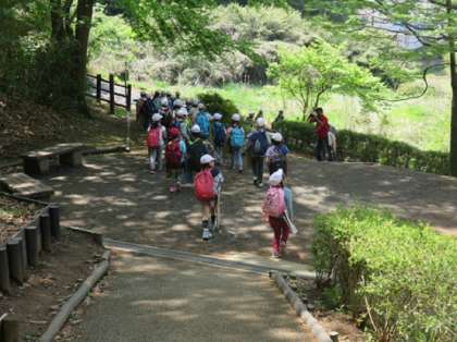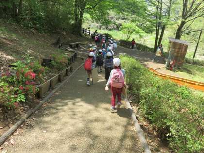 そして、子どもたちがたっぷり体験したあと、上の広場を後にして、昼食場所の下の広場まで移動していました。坂道も前の人との間を大きく開けることなく、子どもたちは上手に歩けていました。