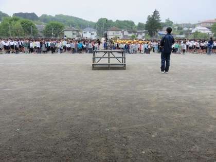 月曜日には、毎週ではありませんが、児童朝会が行われています。今日の朝会から、一年生が一緒に参加します。今日の朝会では、校長先生のお話を聞きました。