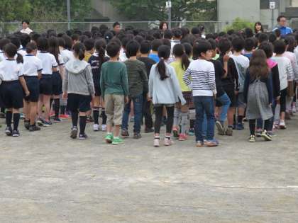 児童朝会のたびに、4年生と5年生は、『回れ右』で後ろ向きになってから、集団で並んで歩いています。『回れ右』などの基本動作も、大切にして、しっかりと覚えられるように、ちょっとした場面も活用して、子どもたちへの定着を図っています。