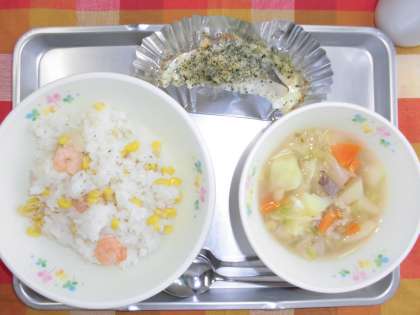 本日は、白身魚のチーズパン粉焼きを作りました。使用した魚は「メルルーサ」という深海魚です。魚に下味をつけ、粉チーズ、パン粉、パセリを混ぜ魚にかけ、上からオリーブオイルをかけ、オーブンで焼き上げました。メルルーサは切り身にすると、骨のない魚です。子どもたちは、「食べやすい!」と喜んでくれました。