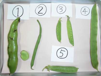 初めに、5種類の野菜の中から、班のみんなでどれがグリンピースか考えてもらいました。みなさん一生懸命観察してくれました。一つずつ正解を発表しながら、野菜の説明をしていきます。