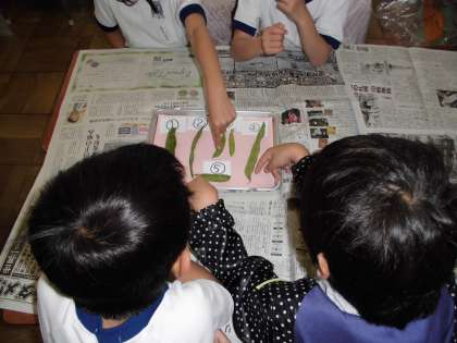 5月11日、給食では「グリンピースごはん」を作りました。そのごはんに入れるグリンピースは、2年生のみなさんにさやむきをしてもらったものです。それでは、授業の様子を紹介します。