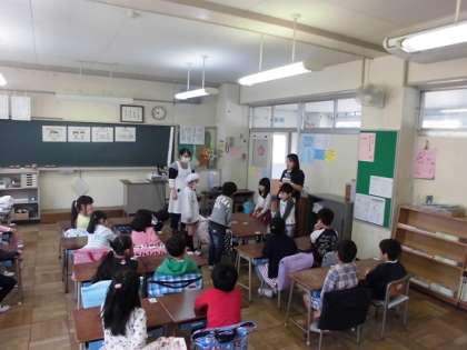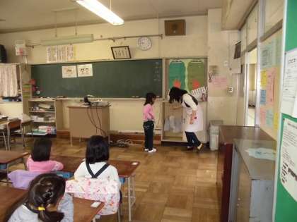ワゴンに載せられた給食の勉強が終わると、次は、給食当番の身支度の学習です。教室の中の白衣の置き場所を勉強したり、給食当番のお仕事を教えてもらったりしていました。