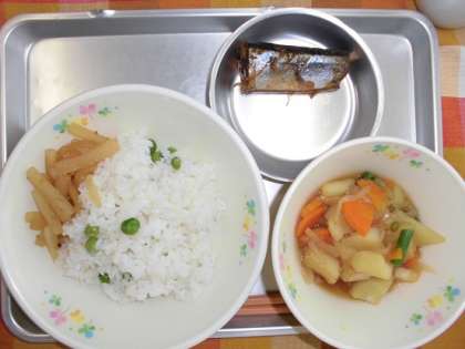 さんまの梅煮、じゃがいものうま煮、大根のごま醤油、牛乳のほかの品物と一緒に、子どもたちがむいたグルーンピースは、『グリーンピースご飯』として、全校の子どもたちの給食になりました。