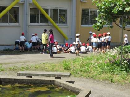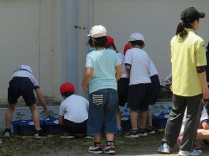 子どもたちは、植え終わった苗に水をあげて、お世話を早速始めました。