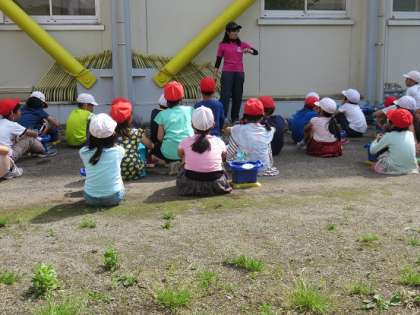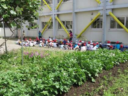 2年生が活動をした中庭では、6年生が理科の学習で使うじゃがいもの茎や葉が大きく育っていました。
