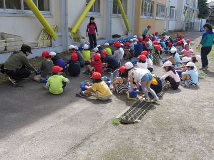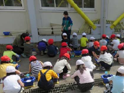 先生のお話を聞いて、子どもたちはミニトマトの苗を植えました。