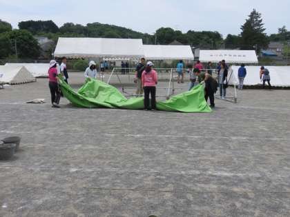 こどものうち八栄寮の先生方には、お借りしたテント6張りを、施設の車で、本校まで運んで来ていただけています。そして、この日のテント張り作業も、初めてテント張りをする保護者の方も分かりやすく指示を出していただいていました。みんなが無駄なく、スムーズに作業ができていました。