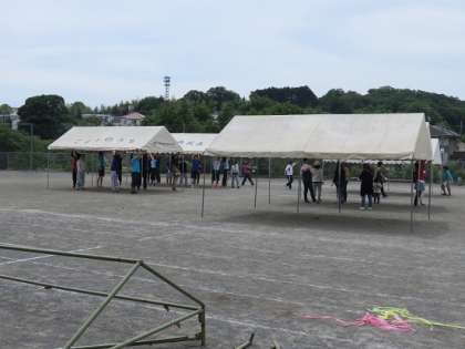 児童用の12張りのテントは、小石拾いや湯殿川沿いの側溝清掃と合わせて、1時間ちょっとの時間で作業を終えることができました。