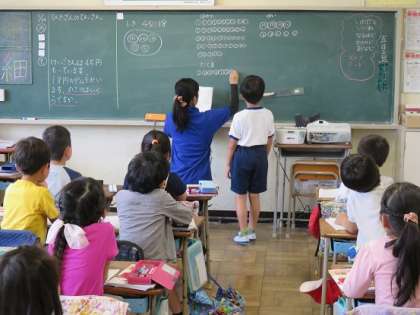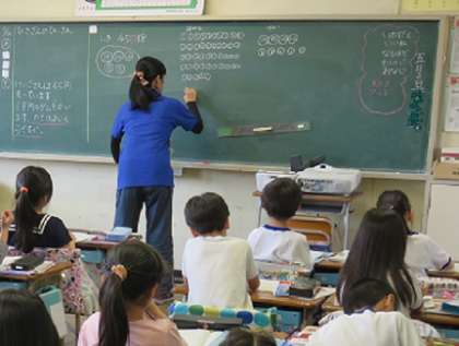 この日の学習課題は、ひき算の単元で『けいさんのしかたをかんがえよう』です。子どもたちに、どのように考えると答えにたどり着くか、自分の考えを考え出させました。そして、各々が考え出した考えを、黒板に順に発表させていました。上手に自分の考えが、2年生の発達段階に応じて、工夫しながら、発表力が高まるように支援していました。