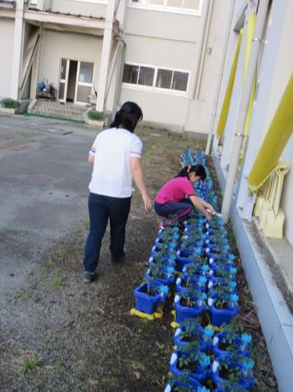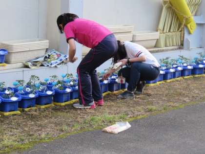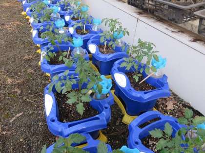 放課後の中庭を覗くと、子どもたちの実のトマトのお世話をしている担任の先生方の姿がありました。子どもたちが苗を植えた、一鉢一鉢に割り箸を刺していました。