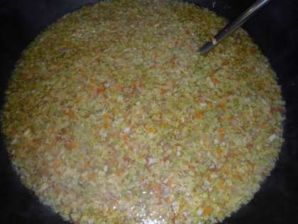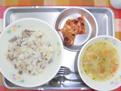 今日は、根菜ピラフを作りました。バターとごはん、にんじんを一緒に炊き込み、レンコンや玉ねぎを炒めた具材をごはんに混ぜ込みます。バターの風味がよく効いていました。