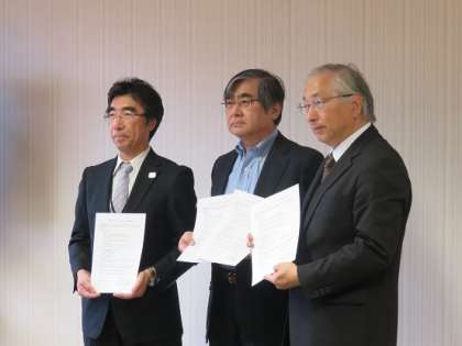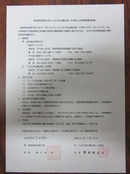 東京家政学院大学との連携では、本校の卒業生が進学する椚田中学校も一緒に行われました。調印の記念して、大学の学長先生を中心に、椚田中学校の校長先生と、本校の青木校長が写真を撮られていました。