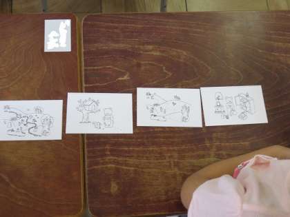 『はなのみち』のお話の順番を、大きな場面絵とともに、手元のカードを並び変えながら、お話の流れを理解していました。