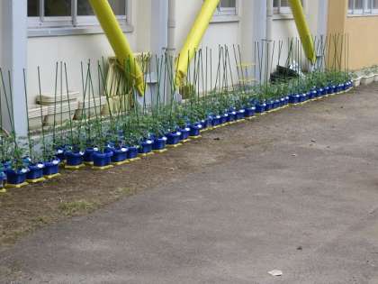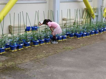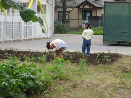 中休みになると、2年生の子どもたちは、自分で植えたミニトマトやサツマイモの苗がどうなっているのか心配で、水やりにきていました。カラカラに乾いた畑が子どもたちのお水を勢いよく吸い込んでいました。
