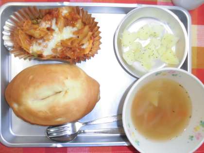 ラザニアを作りました。ひき肉と玉ねぎを炒め、ゆでたマカロニと手作りのルウを混ぜてカップに入れて焼き上げました。マカロニが入っているので、食べ応えがいいメニューです。