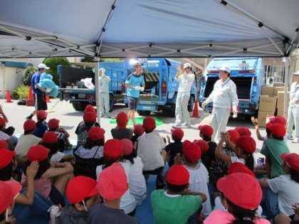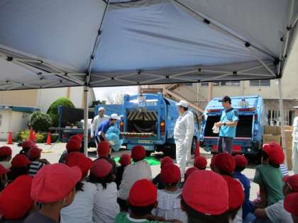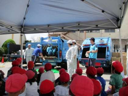 ゴミ収集車でのごみの集め方を見せていただきました。