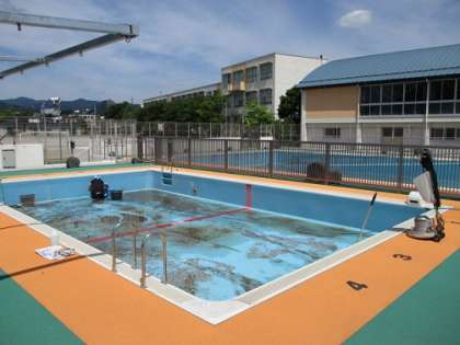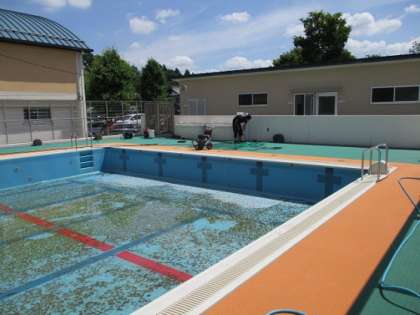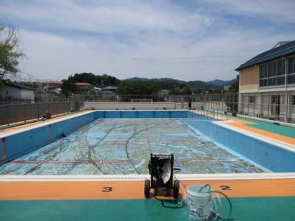 子どもたちが心待ちにしているプールでの学習に備えて、準備を進めています。この日は、委託業者の方々によるプール清掃が行われました。この作業のあと、教職員によるプールの準備を行って、子どもたちが安全に水泳の学習を進められるようになります。