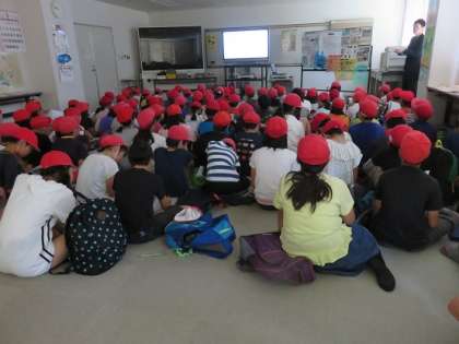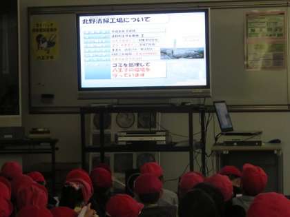 4年生の子どもたちは、最初に、北野清掃工場などの仕事の様子がまとめられたDVDを視聴しました。
