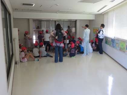 ゴミ収集車からゴミプールへの搬入口の様子を眺めたり、焼却炉の様子を教えていただいたりしました。窓越しでしたが、焼却炉の熱が伝わってきていました。