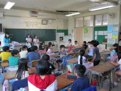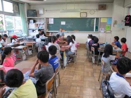 児童集会の時間に、『なかよし遊び集会』の顔合わせがありました。本校では、1年生と6年生、2年生と5年生、3年生と4年生がグループになり、クラスの半分ずつが相手の学年の子どもたちと一緒に遊びます。この日は、一緒に遊ぶ子どもたち同士での顔合わせが行われました。