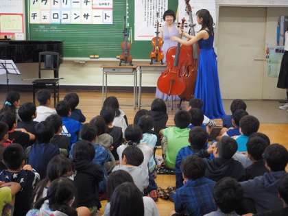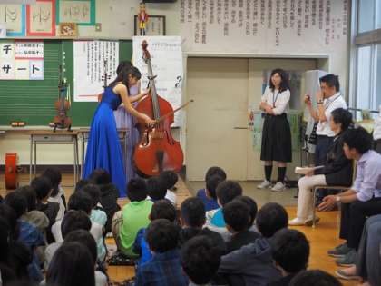 バイオリン、ビオラ、コントラバスなど、弦楽器の大きさと音の響きの違いを、子どもたちは、体感していました。