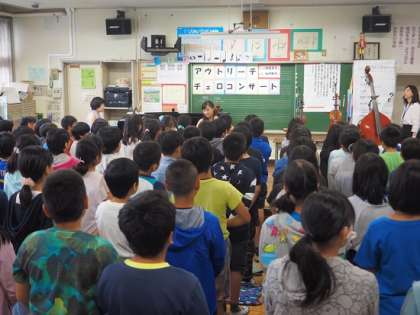 チェロコンサートでは、子どもたちは演奏を聴くだけでなく、チェロやピアノの演奏に合わせて、愛唱歌『ゆめのはな』の合唱もしました。