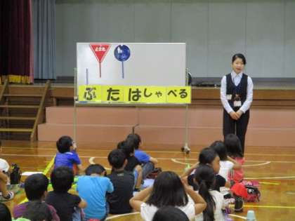 校庭での実技講習とともに、子どもたちは、体育館で自転車の正しい乗り方についてのお話をお聞きしました。
