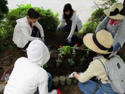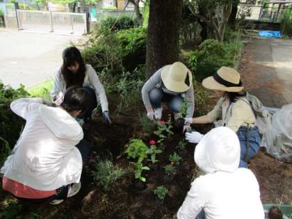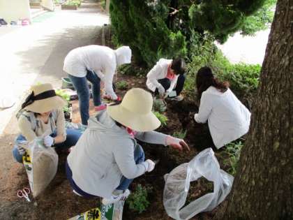 南校舎沿いの樹木の下の花壇の所に、花の会の皆さんが、花の苗を植えていただきました。