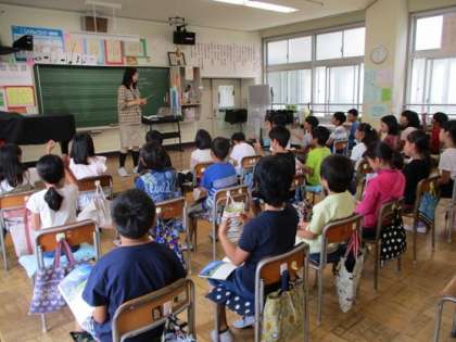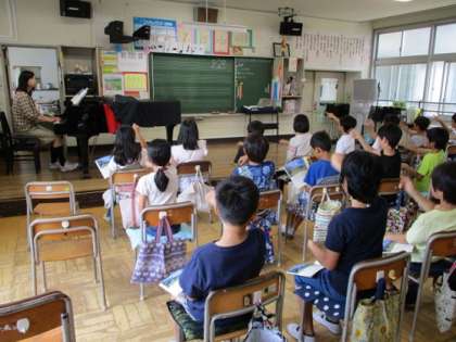 先生から習った3拍子の指揮棒の降り方を、子どもたち全員で練習しました。そして、子どもたちの指揮で、みんなで合唱をしていました。