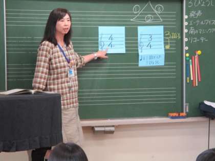 3拍子の指揮の仕方のほかに、4拍子の指揮の仕方も教えてもらっていました。先生がピアノで演奏した曲を聴いて、何拍子の曲か考え、実際の指揮をする練習もしていました。