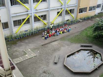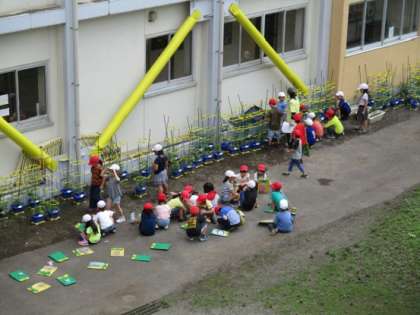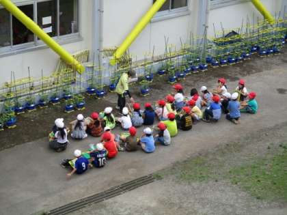 雨の合間を見計らって、2年生の子どもたちは、生活科で育てている植物の観察やお世話をしています。ミニトマトにも、緑色の実が房になって付き始めていました。