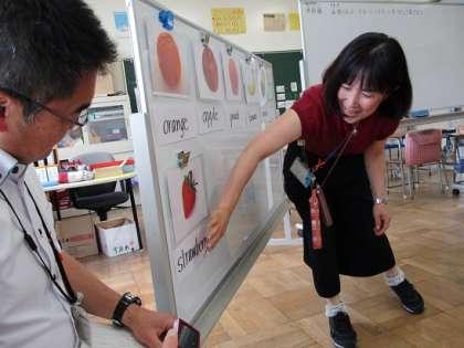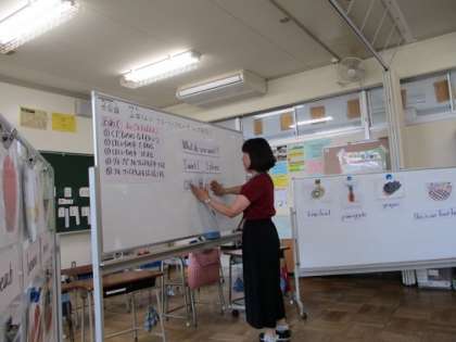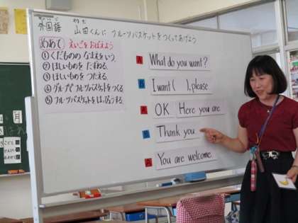 この日の外国語活動は、『山田君に、フルーツバスケットをつくってあげよう』と言うう設定で、そのために必要な英会話の話し方を覚えることがめあてでした。