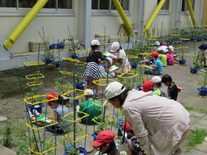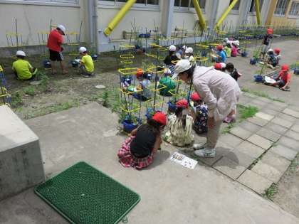 子どもたちの植えたミニトマトの苗も、子どもたちのお世話のかいがあって、すくすくと育っています。そんなミニトマトを、子どもたちは、熱心に観察し、観察カードに仕上げていました。