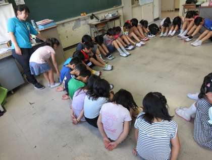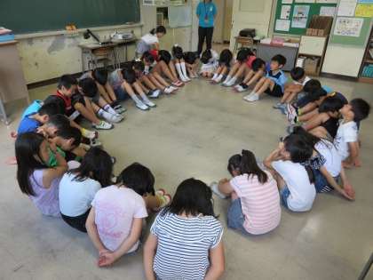 校庭ではなく、教室に集まった子どもたちは、下の学年の人も楽しめるように遊びの内容を考えて、工夫して遊びを進めていました。床にまあるく座って『ハンカチおとし』をしていた子どもたちも、走り方を工夫するなど、みんなが楽しめるようにしてくれていました。