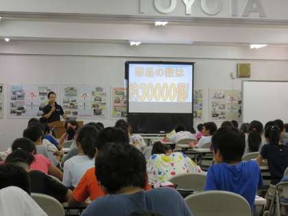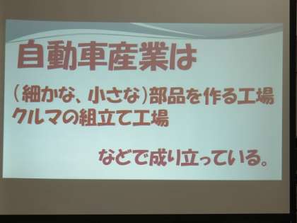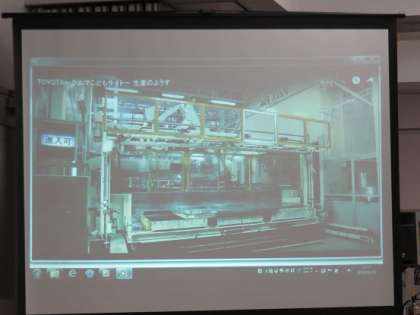 自動車工場での自動車づくりの様子を、プレスして車のボディーを創り出すことやシートなどの部品を組み込む様子など、映像を通して、教えてもらえていました。