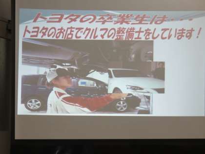 トヨタ東京自動車大学校で勉強をしている学生さんは、整備士の資格を取られて、卒業後は、『自動車のお医者さん』として、トヨタのお店などで、自動車のお仕事に就かれています。