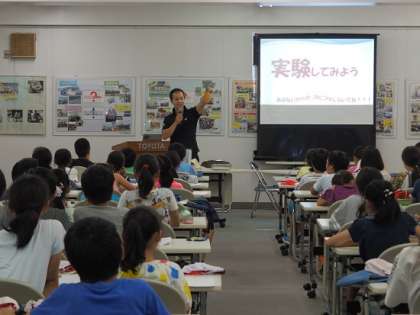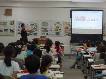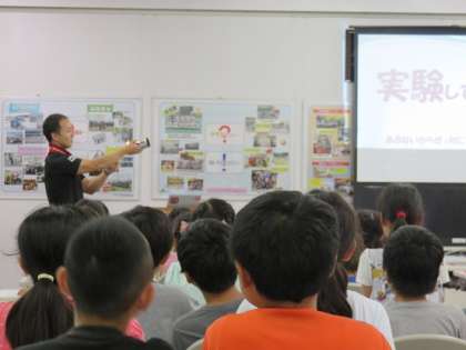 大学校の先生は、お話や映像、そして、寸劇のほかに、実験も見せてくれました。トレーの上のガソリンはただ燃えているだけですが、テニスボールのケースの中に入れたガソリンの気体が、燃えると蓋を飛ばすような力ができることを、実験で見せてくれました。