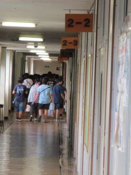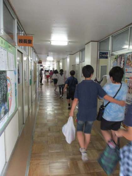 椚田中学校の校長室の前の廊下も、子どもたちは通りました。椚田中学校の校長先生は、あいにくお出かけでお会いすることができませんでした。